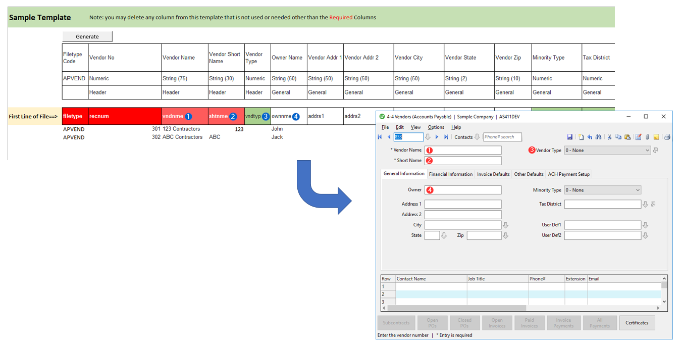 Are you tired of manually keying in Vendors one by one into Sage 100 Contractor? Would you rather download your vendors, fill in the blanks in Excel and import the details directly into Sage 100 Contractor? The following integration template allows you to do just that. It mimics every feature and function of the 4-4 Vendors data entry form.